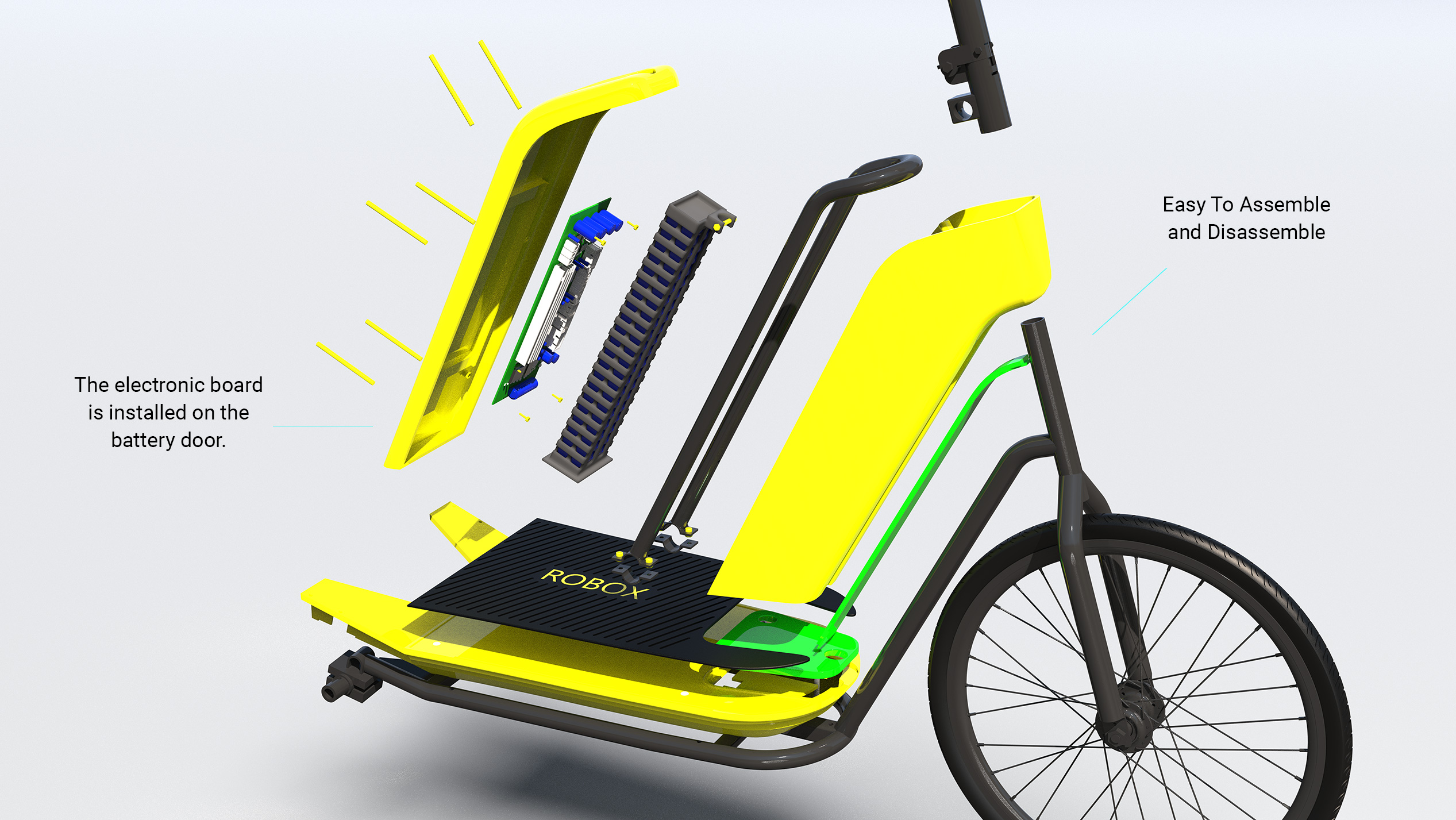 We made several changes to the design, one of which was adding more batteries to increase the scooter’s range. As a result, more space had to be allocated for the battery case. To accommodate this, I positioned the charger on the side of the body, allowing me to place the electronic board on the scooter’s cover.