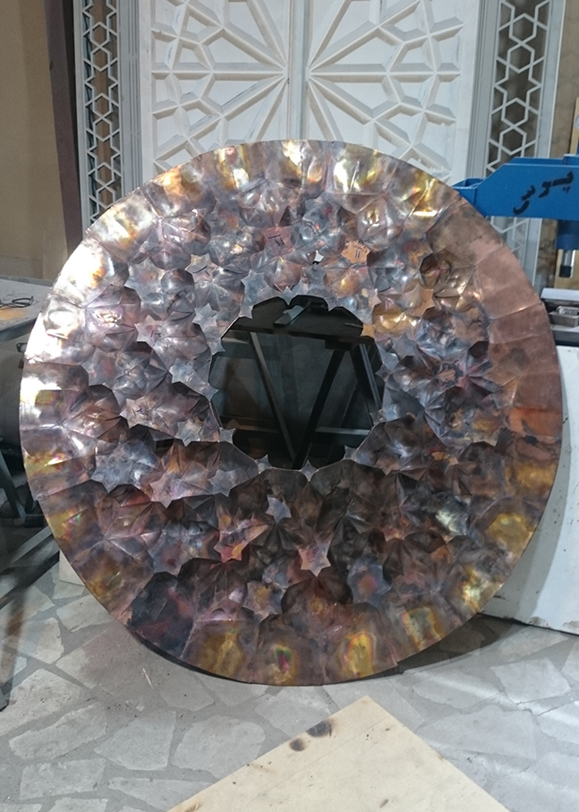 After welding all the pieces together and forming the table, we polished it through several stages to reveal the true color of the copper sheets. This process brought back the natural copper hue. Next, we needed a design for the tabletop. We wanted it to complement the Qur’an and showcase intricate details. So, we prepared a series of traditional patterns and lettering, which we transferred onto the table through a complex process.